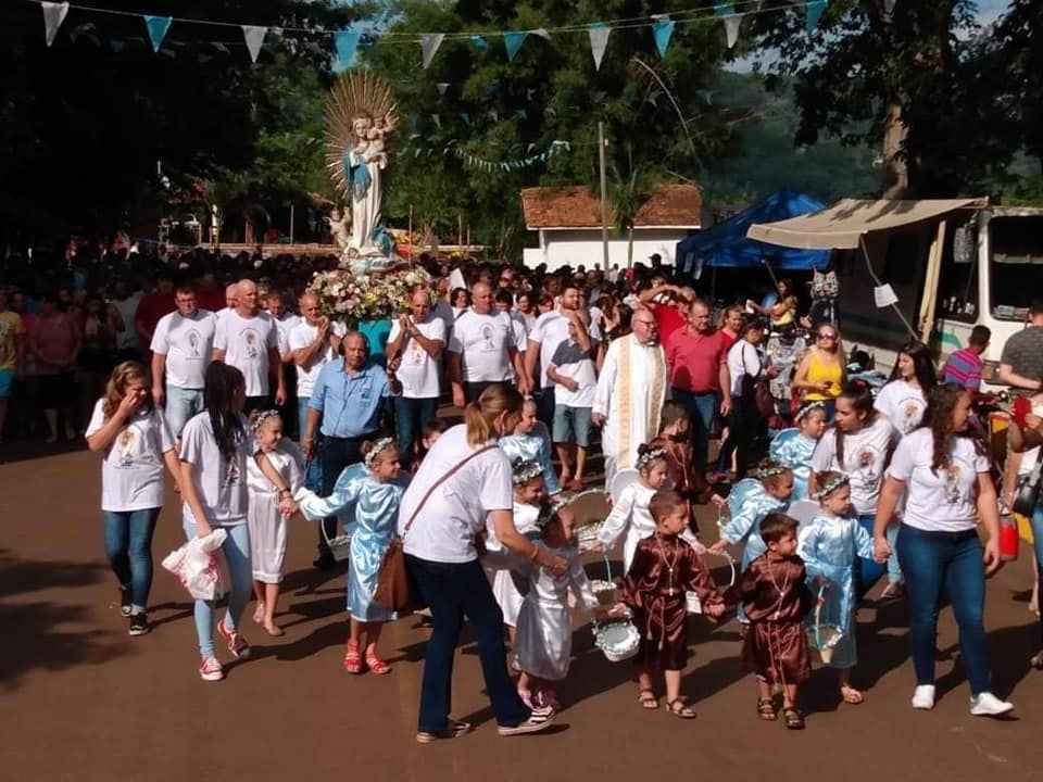 O dia começou cedo, com alvorada festiva, seguido pela procissão com a imagem da padroeira pelas ruas da cidade até o pavilhão de festas, às margens do Rio Uruguai. Ali foi celebrada a Santa Missa, presidida por nosso Bispo Diocesano, Dom Liro Vendelino Meurer, e concelebrada por padres presentes.